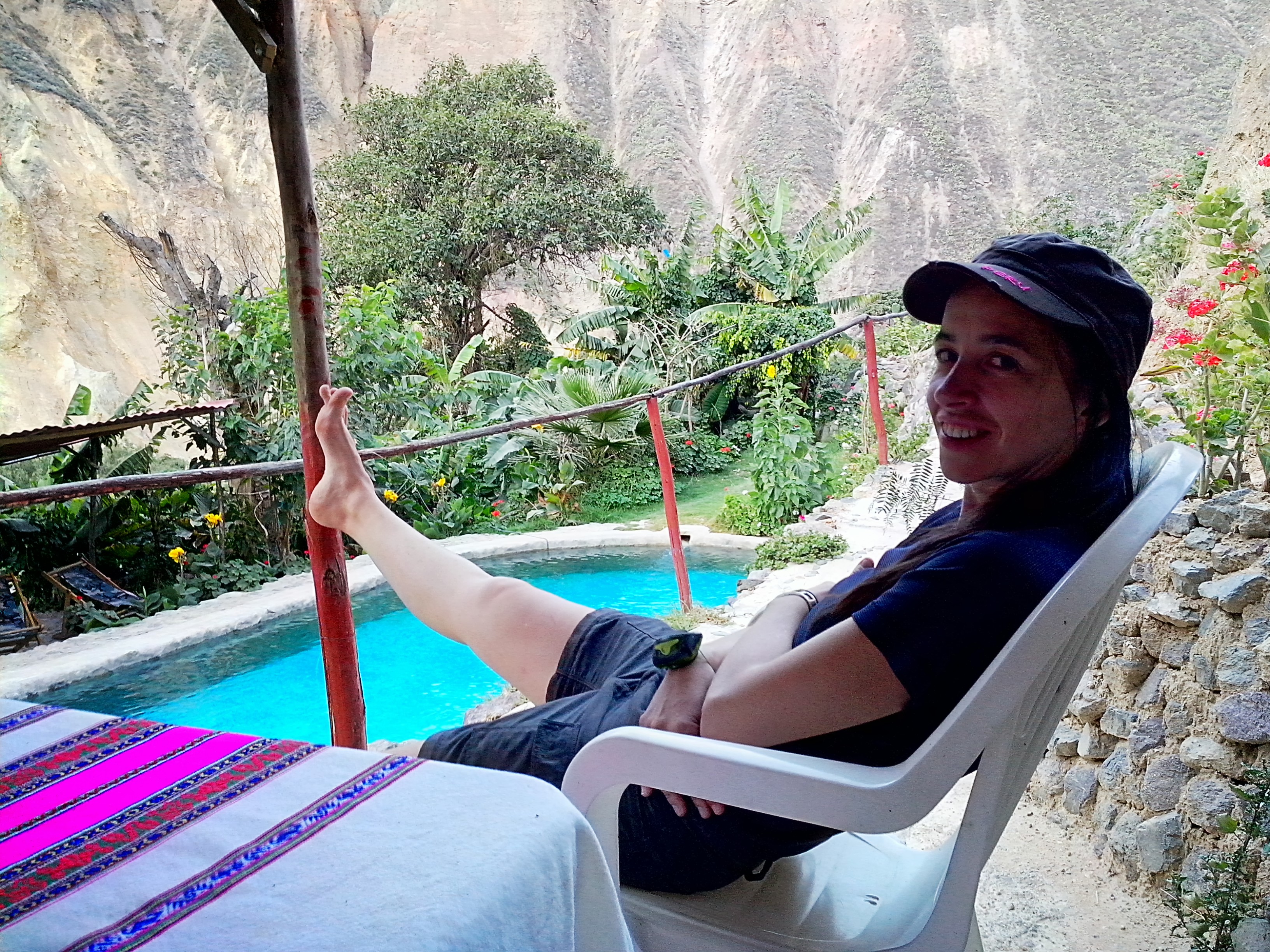 There Nuria had a bath on a swimming pool of our Oasis Paradise Lodge, of course just running water from the river, great location and a swimmingpool.